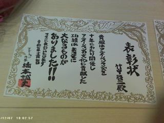 また、2日目懇親会では、出品作家の橋本誠史氏と多田文ヒコ氏より、今年で10周年のAnimation Runs! の開催に感謝を込めて、主催者の竹中啓二氏と小田かおり氏に表彰状の贈呈があり、橋本夫人の「威風堂々」の独唱をバックに贈呈式が行われました。