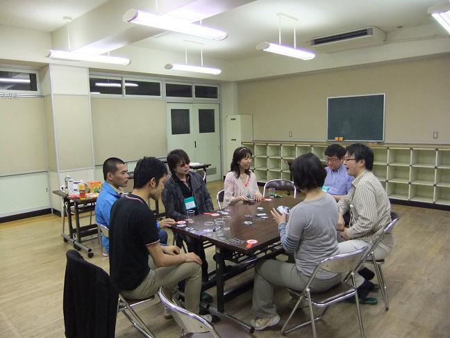み:ここで一度、テーブル分けを変えたんだっけ。 織:ほんとはもっと頻繁に変える予定だったんですけど、人数が少ないので、あまり変えなくとも充分交流できました。 み:『ドメモ』が好評で、もうちょっと遊びたい、という声があって。 織:引き続き『ドメモ』を遊ぶテーブルと、別のゲームを遊ぶテーブルに分かれたんです。 み:織神くんは『ドメモ』のテーブルに行ったんだよね。 織:みやびさんは何をやってたんですか? み:『ヘックメック』を遊んでた。これも遊ぶのに夢中で写真を撮り忘れちゃった。てへっ。 織:てへっ、じゃないですよ〜。仕方ないですねぇ。で、どんなゲームなんです? み:ダイスゲームだよ。詳しいゲームの内容は注釈を見て欲しいんだけど、ダイスゲームだけに、ギャンブルっぽくて燃えた。 織:へー。 み:もちろん確率を計算して可能性の高い手を探るわけだけど、最後は運だからねぇ。 織:運……。それって、みやびさんに最も無いものじゃないですか! み:し、失礼な! 織:だって……勝てたんですか? み:負けた。 織:…………。 み:…………。 織:ファイトです! み:お、おう! そろそろ時間も押し迫ってきて、閉会式まで一時間ってところまで辿りつきました。 どうやら、最後のゲームになりそうです。 み:というわけで、今回の目玉だね。 織:はい♪ み:再び『キャット&チョコレート』だ。 |