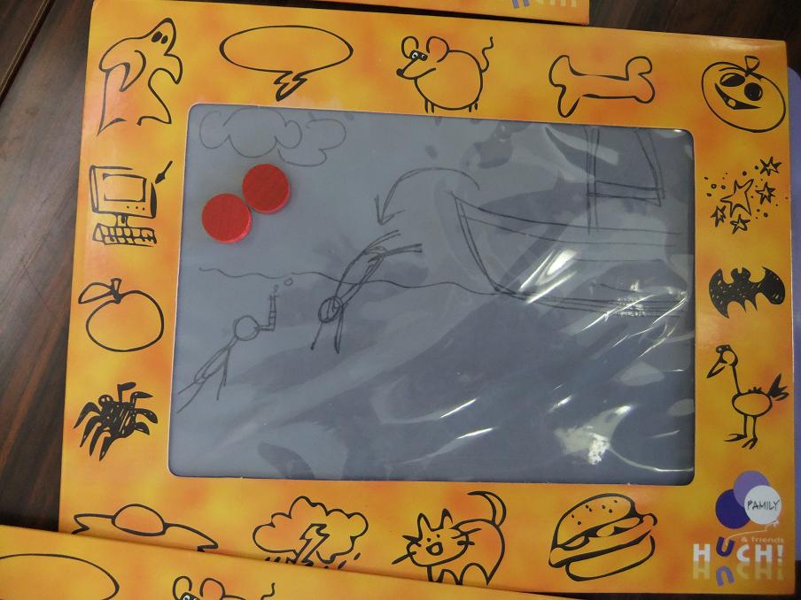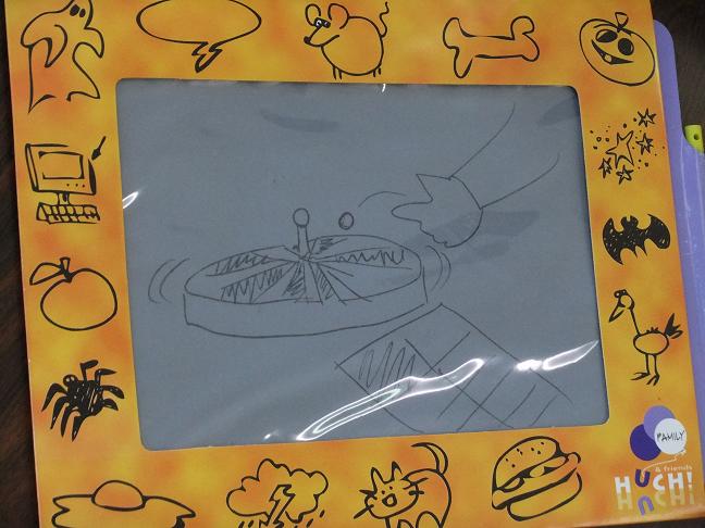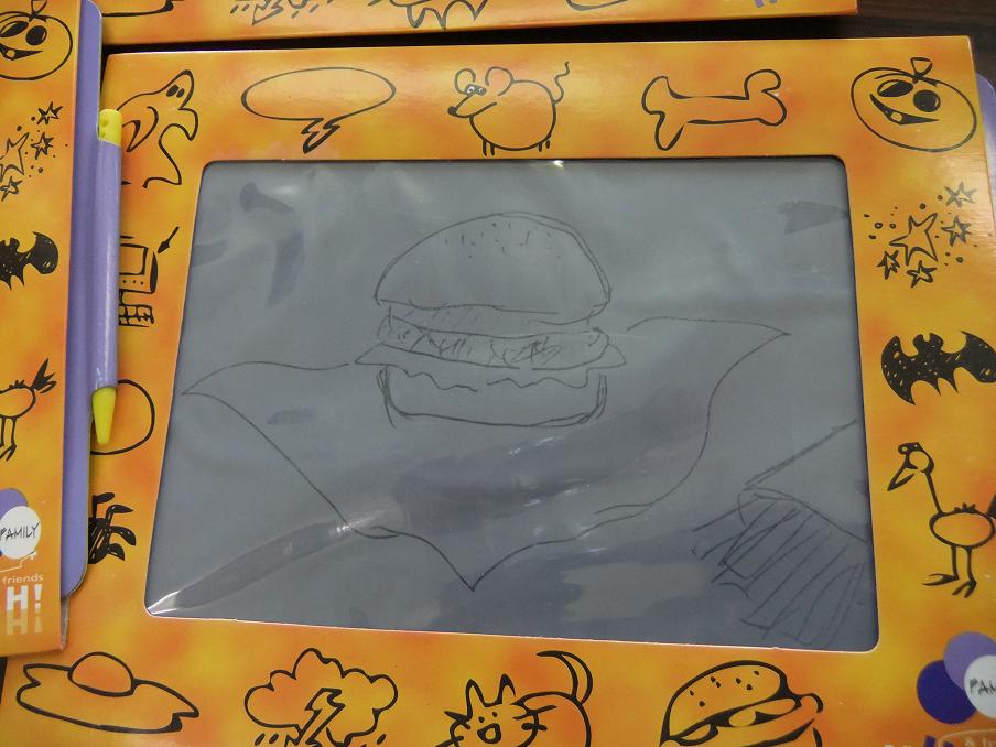 織:……結局、危機を乗り切れなかったのはみやびさんだけでしたねー。 み:手、手札(アイテム)がよくなかったんだよ! 織:(じとー) み:つ、次に行こう、次! 織:じゃあ、せっかくですから、もうひとつ全員で遊べるゲームをやりましょう。これです! み:おお、それは『グラフィティ』じゃないか。 織:これは8人まで遊べます。つまり僕やみやびさん、インストラクターの(ず)さんまで含めて全員が遊べちゃいます。 み:やろうやろう。 『グラフィティ』はお絵かきゲームです。 カードで提示される「お題」にしたがってプレイヤーたちが絵を描き、描いたイラストを見て、親役の人が「お題」を当てます。当てると点が入るわけですね。それから、一番上手く描いた人にも点が入ります。 一見、絵の上手いひとが有利なように思えますが、誰が描いたか当てられてしまうと、親に点が入り、当てられなければ絵を描いたひとに点が入る、というルールになっていますので、上手く描けば描くほど、あるいは個性的に描くほど、親からカモにされてしまって、ある意味で損をするわけ。 そのあたりのジレンマも面白いところです。 み:このゲームの面白さは、なかなか文章では伝わらないかもね。というわけで、写真を撮っておいたぞ。 織:おお!? み:さて、この写真の中のイラストを見て、「お題」がわかるかな? 織:車輪! み:はずれー。 織:おやぁ……? み:じゃ、もう一枚見せよう。 織:あ、わかりやすい。これは──ルーレット♪ み:あたり! これはその回で一番として親から2点もらったイラストだ。 織:納得です。 み:お絵かき終了直後の風景も写してみた。 み:こんな感じ。 織:おー、みんな真剣だぁ。 み:では、ここで今回の名画伯たちの描いた傑作をいくつか紹介しようか。 織:なんですか、この最後のアヤシイ踊りは……。 み:絵にコインが2個載っているってことは、このイラストがその回の最優秀ってことだ。 織:さいゆうしゅう……。あー、思い出した! これって、確か──。 み:おっと、ネタばれはそこまでだ! ゲームを遊ぶひとのために、このイラストのお題は隠しておくことにしよう。みなさんも考えてみてくださいね。 織:わかるかなぁ、これ。 み:なんてところで、そろそろ開始から2時間だ。 織:早いですねぇ。じゃあ、ここからはテーブルを2つに分けましょう。 というわけで、テーブルを2つに分けて遊びました。 ここでは、テーブルAとBとして紹介しましょう。 |