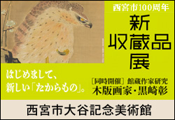 ◎2025年に4月の西宮市100周年を期に新たに収蔵した勝部如春斎、金山平三、辻愛造、秦森康屯の作品と東ドイツで製作されたポスターを、関連の館蔵品とともに紹介します。同時開催として、現代木版画の第一人者として国内外で高く評価され、京都を拠点に活躍した黒崎彰(1937〜2019)の小企画と、近代日本画コレクションのテーマ展示を行います。