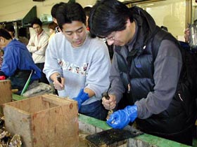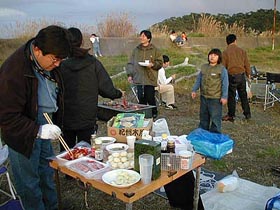 - オフ会の様子 - ・その1:牡蠣剥き場 臨時駐車場、なんかいい感じ 道具はプロ仕様です 関係者以外立入禁止 ・その2:BBQ アウトドアクッキング お子さまも満足? ちょっと押してきましたがまだ続きます たらふく牡蠣を食べた御主人様を待つ車達 あー美味しかった <牡蠣オフHPに戻る>