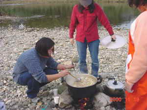 材料もそろって芋煮とご飯を炊いている ところ。 煙で目がしみる〜 でも煙は「男前」の所に行くとか・・・(謎) |