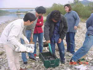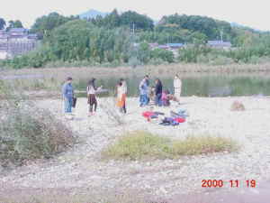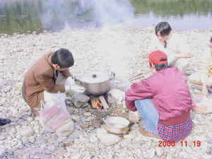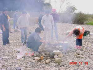 場所を決めて、準備を始めたところ。 石でコンロを作ったり、火をおこしたり。 |