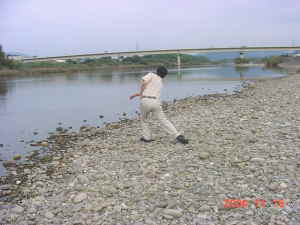 石を水面に向かって投げている岩田さん。 30mくらい跳ねてました。(脱帽) |