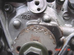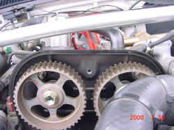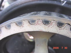 イン側のカムプーリーの接写 プーリーの山のところのベルトにヒビが入ってます。 |