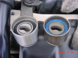 テンショナープーリー。右が古い物で、左が新品。 古い物でも特にベアリングの引っかかり等はありませんでしたが、 ついでなので替えてしまいました。 |