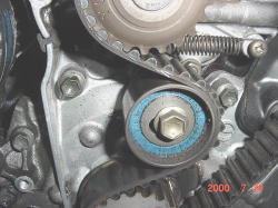 青く見えるのはテンショナープーリー。 その右上にあるのがテンショナースプリング。 今回はこの二つも一緒に取り替えました。 |