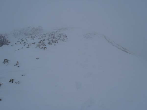 一ノ倉岳へと登り返して行くが、やっぱりピークがよく分らない。指導標はない模様。避難小屋が あるはずだがそれもまだ雪の中か…。稜線沿いに進んで行く。昨日のような視界のない中、正し い方向に進んでいるという確信を持たずに進むにはあまりにも何もない稜線だった。 |