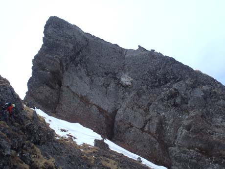 3ピッチ目。1段上がったところでまた行き詰まる。最初、右に行こうとするが、 進行方向に合う向きのホールドがなく断念。直上することにするが、残置支点は なく、必死に上によじ登る視界の隅で岩に掛けた支点のスリングが外れてしまっ たのが見える。上がってみると、右の方向に残置支点があり、やはりあそこで右 に行かなければならなかったんだなと思う。 |