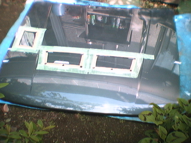 型紙(ダンボールなど)を採って、ボンネットの開けたい場所に貼り付けます。マスキングテープだと粘着力が弱いので、ガムテープで止めました。