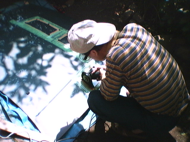サンダーを使って、一気に切っちゃいます。その際、裏側の骨を残すようにします。骨まで切ってしまうとボンネットの強度が落ちてしまうから…。ボンネットと骨は接着されていますが、強引に引っ張れば取れます。後は勢いだけです、、、。写真はうちのおやじ。