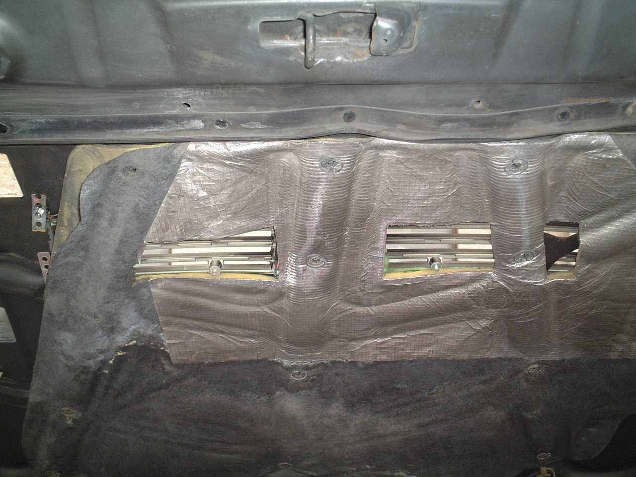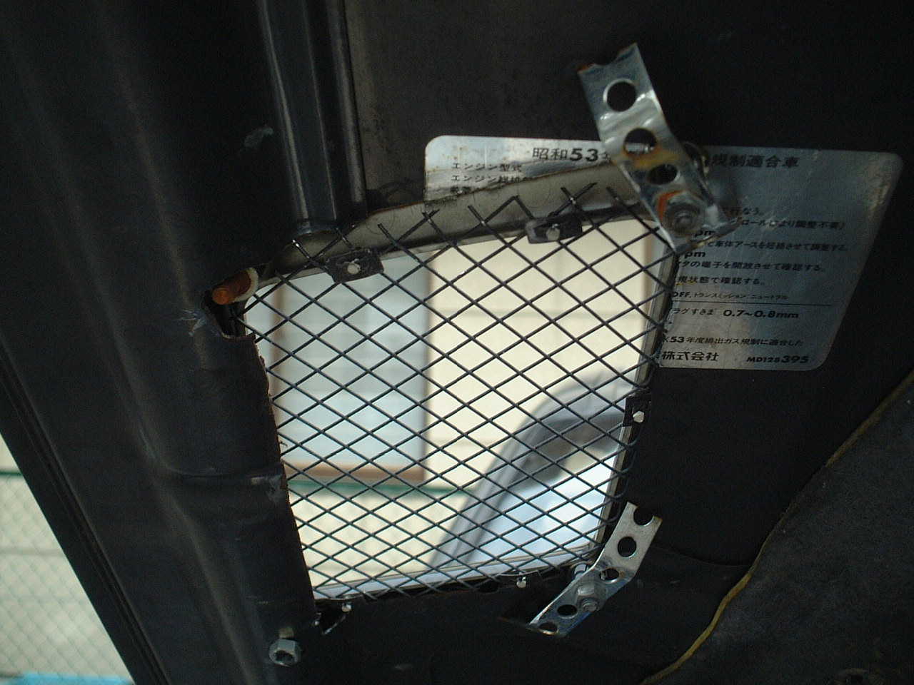 穴を開けたら、現物あわせでヤスリを使って上手くはまるまで根気強く削ります。切り口は、錆が出ないように塗装しておきます。ダクトをボンネットに固定するのは、カー用品店やホームセンターで売っている凡用ステーを折り曲げてナットで締めていきます。