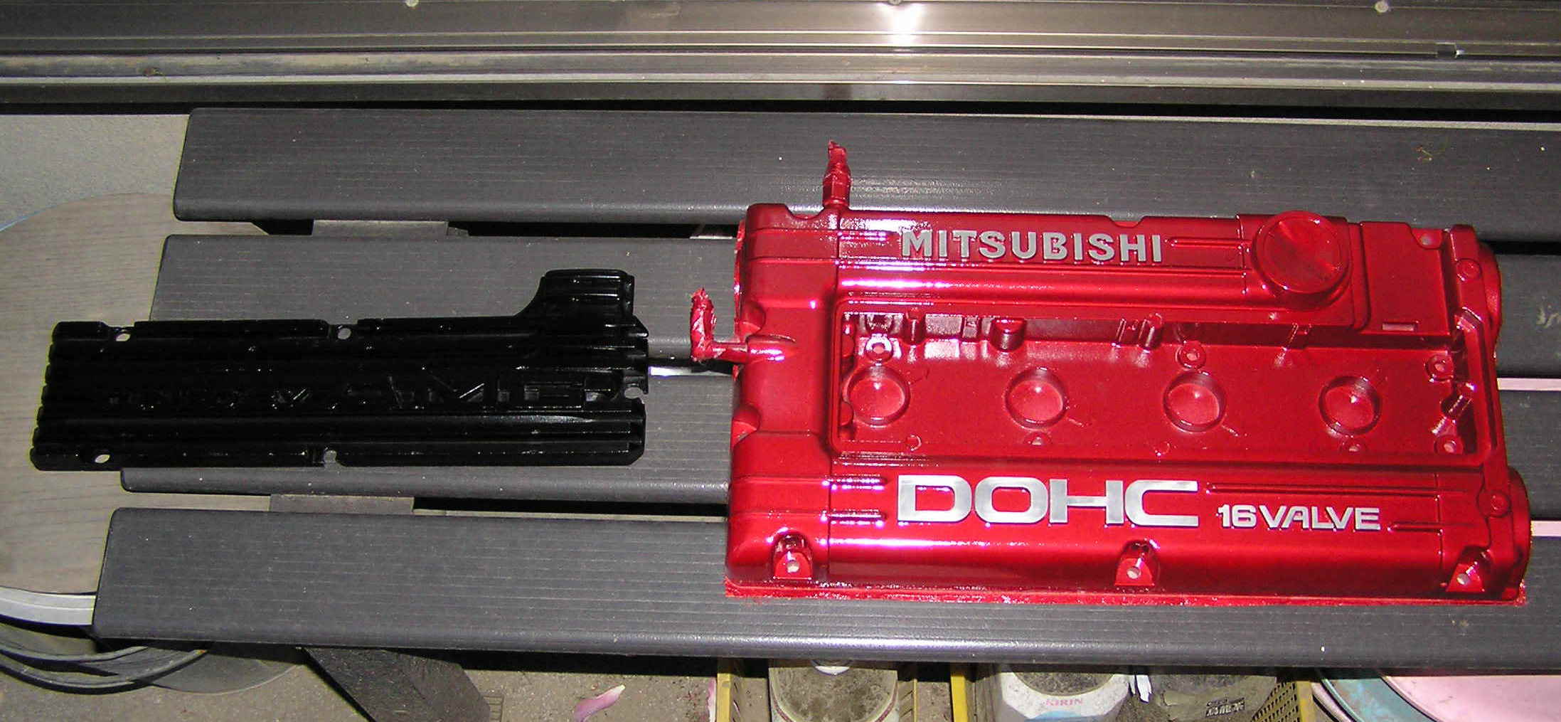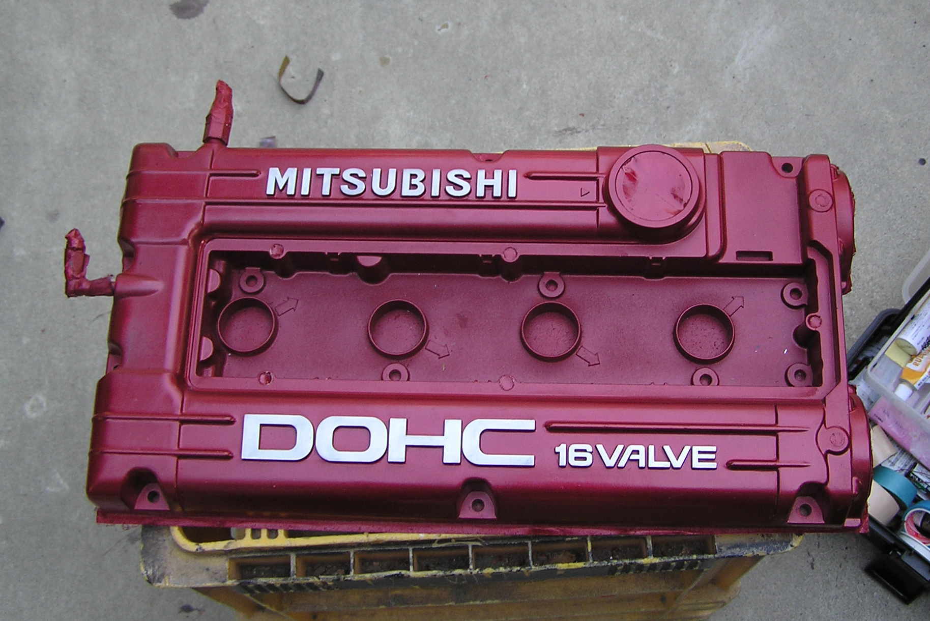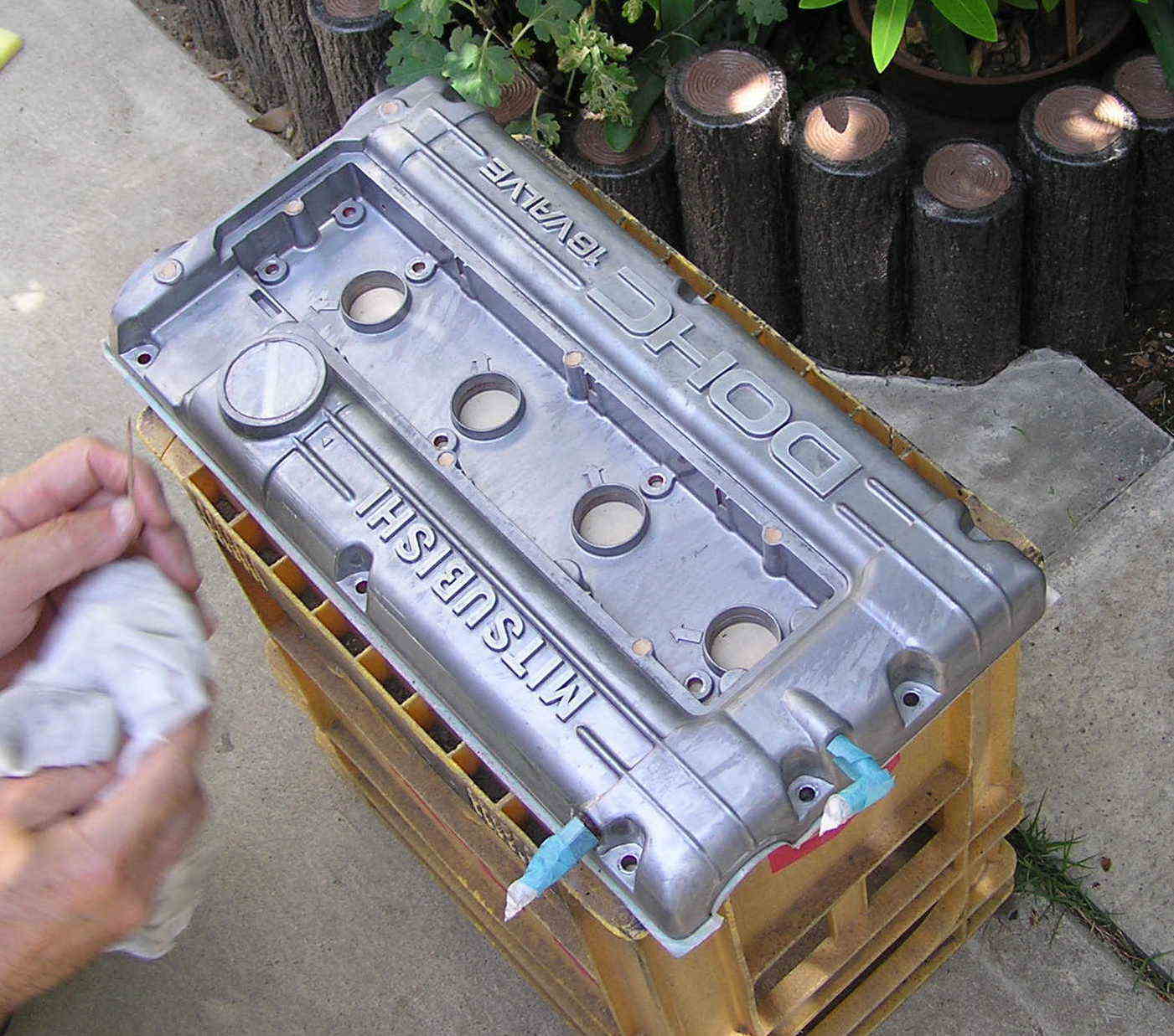 「MITSUBISHI」と「DOHC 16VALVE」の部分の塗装を剥がし、磨きをかけます。