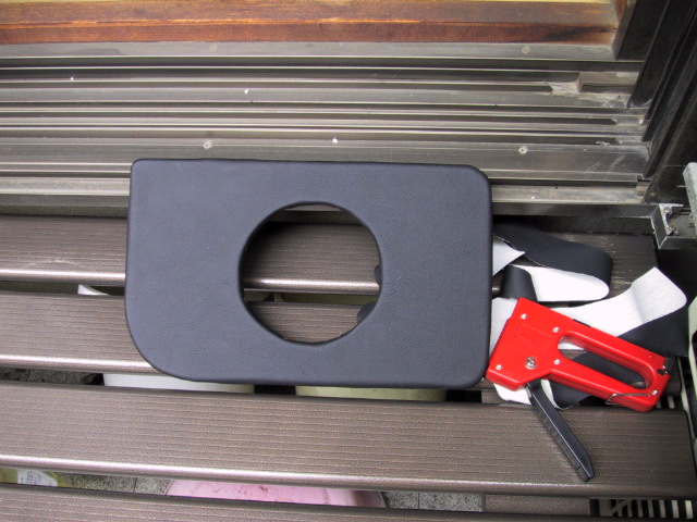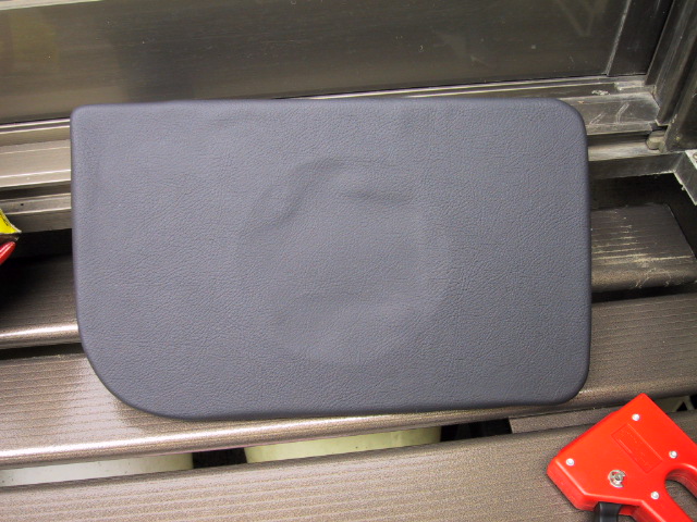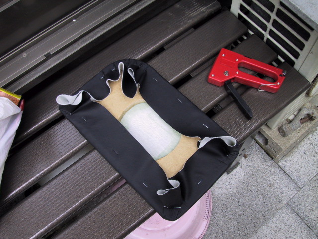 レザーは引っ張りながら貼っていきます。特に角の部分はよく引っ張ってしわの出ないよう気をつけます。裏側はしわになっても見えないので、しわを裏に寄せながら貼ります。裏に引っ張ったレザーはタッカーで「バチンバチン」と止めます。