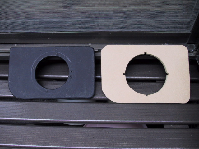 例のごとく、型紙を作ってMDFをカットします。穴の大きさなどはスピーカーに型紙が入っていたのでそれを使いました。ジグソーで一気に切ります。写真左が古いボード、右が新しく作ったボード。ちょっと大きくなりました。