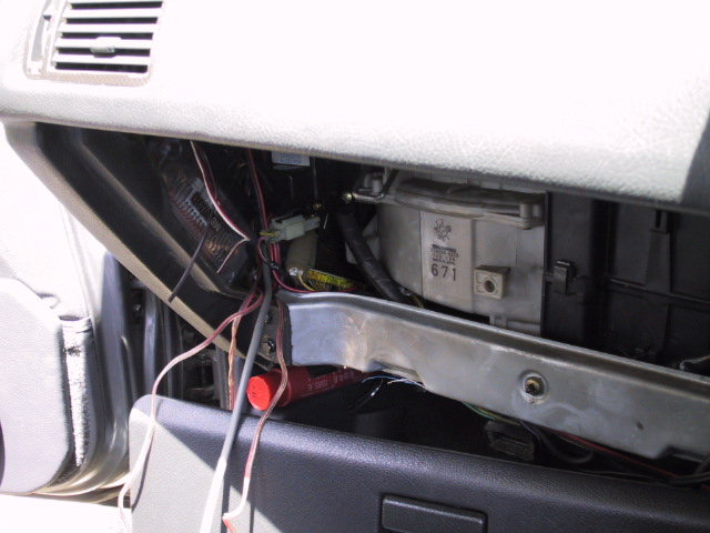 ネットワークを設置します。運転席側は、ハンドルの下に隠し、助手席側は写真右のようにグローブボックスを外して左端に押し込みました。こんなのでいいのかってかんじですが、とりあえず場所がないもので…。