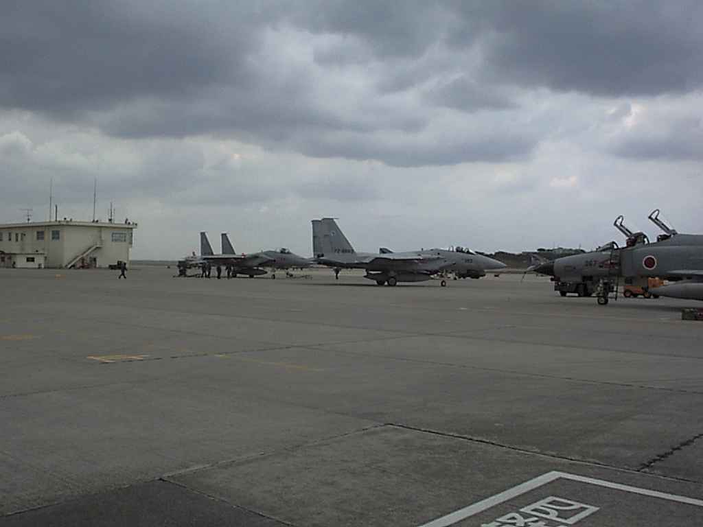 フライトを終わってランプインするF−4EJ改滑走路の向こうの赤い柵の先は東シナ海です。