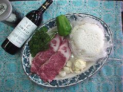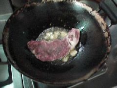 2、片面をすばやく焼く。焦げ目がついたらスライスしたニンニクを入れ肉を裏返す。ほどよく焼けたところで、赤ワインを入れる。フライパンを斜めにしたりして、火を入れアルコールを飛ばし、醤油を入れる。(大さじ3杯くらい)