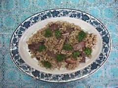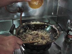3、焼き上がった肉をいったん取り出し、フライパンにバターとごはんを入れ塩・胡椒等で味を調え、あとはよく混ぜながらいためる。(程良く混ざればOK)