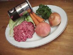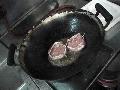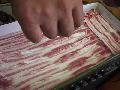 4、フライパンを良く暖め、油を引き、3,べーコン巻味付け挽肉を入れ片面を強火 で 焼きます、焦げ目が付いたら返して中火にしさらに返します、そこで弱火にしてじっくり焼き上げます。後は、付け合わせの野菜と盛りつけて出来上がり。