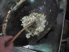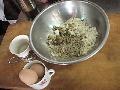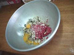 1、予め、玉ねぎ&キノコをバターで炒め、火から下ろし、パン粉・牛乳(無いときは水でもOK要するにパン粉を戻す)を加え冷ます。