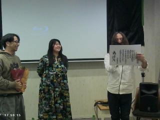 また、2日目懇親会では、出品作家の橋本誠史氏と多田文ヒコ氏より、今年で10周年のAnimation Runs! の開催に感謝を込めて、主催者の竹中啓二氏と小田かおり氏に表彰状の贈呈があり、橋本夫人の「威風堂々」の独唱をバックに贈呈式が行われました。