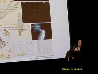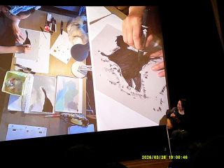 まず短編「やまなし」「カラスの涙」「深海の虹」が上映され、トークに入りました。トークの内容は、自主制作の短編アニメについてのトークに続いて、「花緑青」の特殊効果アニメについての写真・動画を交えたトークが展開されました。