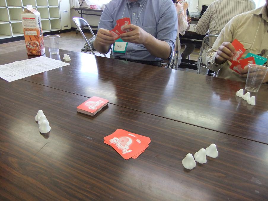 み:ここで一度、テーブル分けを変えたんだっけ。 織:ほんとはもっと頻繁に変える予定だったんですけど、人数が少ないので、あまり変えなくとも充分交流できました。 み:『ドメモ』が好評で、もうちょっと遊びたい、という声があって。 織:引き続き『ドメモ』を遊ぶテーブルと、別のゲームを遊ぶテーブルに分かれたんです。 み:織神くんは『ドメモ』のテーブルに行ったんだよね。 織:みやびさんは何をやってたんですか? み:『ヘックメック』を遊んでた。これも遊ぶのに夢中で写真を撮り忘れちゃった。てへっ。 織:てへっ、じゃないですよ〜。仕方ないですねぇ。で、どんなゲームなんです? み:ダイスゲームだよ。詳しいゲームの内容は注釈を見て欲しいんだけど、ダイスゲームだけに、ギャンブルっぽくて燃えた。 織:へー。 み:もちろん確率を計算して可能性の高い手を探るわけだけど、最後は運だからねぇ。 織:運……。それって、みやびさんに最も無いものじゃないですか! み:し、失礼な! 織:だって……勝てたんですか? み:負けた。 織:…………。 み:…………。 織:ファイトです! み:お、おう! そろそろ時間も押し迫ってきて、閉会式まで一時間ってところまで辿りつきました。 どうやら、最後のゲームになりそうです。 み:というわけで、今回の目玉だね。 織:はい♪ み:再び『キャット&チョコレート』だ。 |
