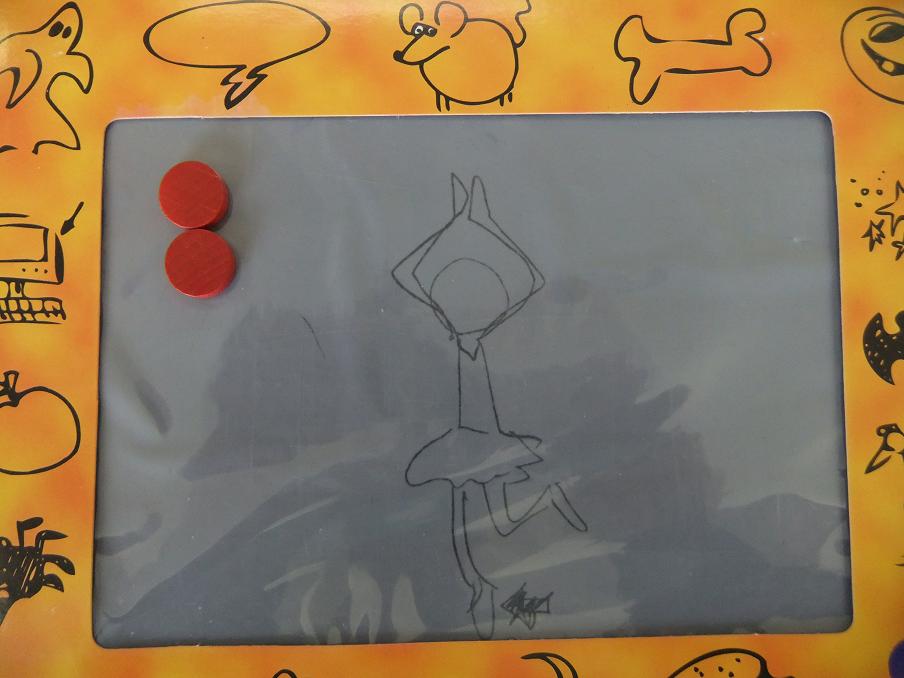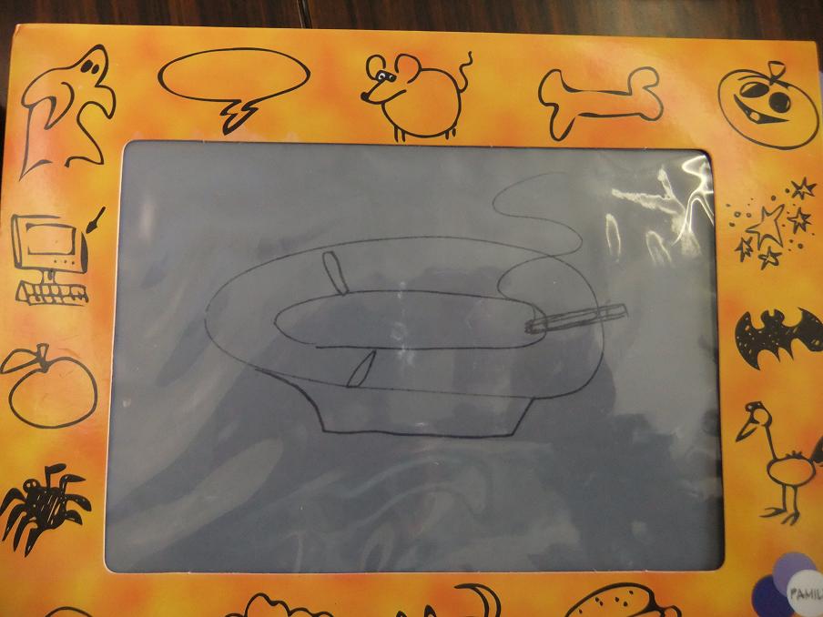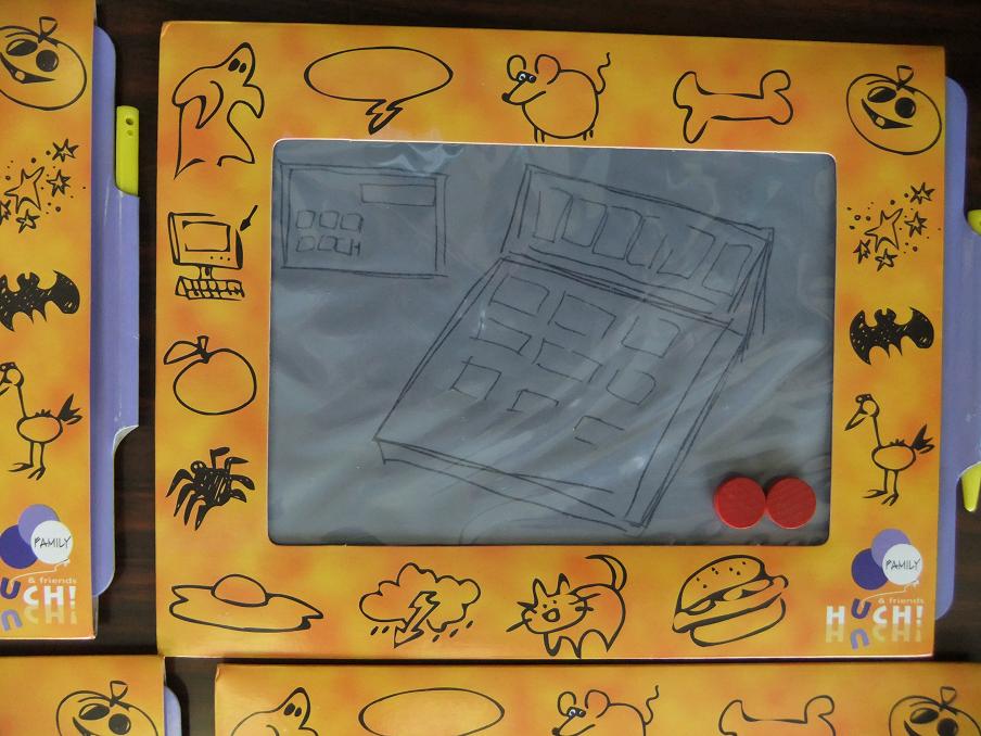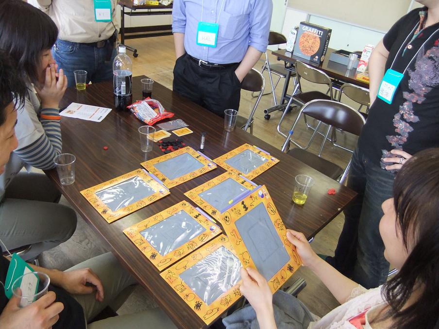 織:……結局、危機を乗り切れなかったのはみやびさんだけでしたねー。 み:手、手札(アイテム)がよくなかったんだよ! 織:(じとー) み:つ、次に行こう、次! 織:じゃあ、せっかくですから、もうひとつ全員で遊べるゲームをやりましょう。これです! み:おお、それは『グラフィティ』じゃないか。 織:これは8人まで遊べます。つまり僕やみやびさん、インストラクターの(ず)さんまで含めて全員が遊べちゃいます。 み:やろうやろう。 『グラフィティ』はお絵かきゲームです。 カードで提示される「お題」にしたがってプレイヤーたちが絵を描き、描いたイラストを見て、親役の人が「お題」を当てます。当てると点が入るわけですね。それから、一番上手く描いた人にも点が入ります。 一見、絵の上手いひとが有利なように思えますが、誰が描いたか当てられてしまうと、親に点が入り、当てられなければ絵を描いたひとに点が入る、というルールになっていますので、上手く描けば描くほど、あるいは個性的に描くほど、親からカモにされてしまって、ある意味で損をするわけ。 そのあたりのジレンマも面白いところです。 み:このゲームの面白さは、なかなか文章では伝わらないかもね。というわけで、写真を撮っておいたぞ。 織:おお!? み:さて、この写真の中のイラストを見て、「お題」がわかるかな? 織:車輪! み:はずれー。 織:おやぁ……? み:じゃ、もう一枚見せよう。 織:あ、わかりやすい。これは──ルーレット♪ み:あたり! これはその回で一番として親から2点もらったイラストだ。 織:納得です。 み:お絵かき終了直後の風景も写してみた。 み:こんな感じ。 織:おー、みんな真剣だぁ。 み:では、ここで今回の名画伯たちの描いた傑作をいくつか紹介しようか。 織:なんですか、この最後のアヤシイ踊りは……。 み:絵にコインが2個載っているってことは、このイラストがその回の最優秀ってことだ。 織:さいゆうしゅう……。あー、思い出した! これって、確か──。 み:おっと、ネタばれはそこまでだ! ゲームを遊ぶひとのために、このイラストのお題は隠しておくことにしよう。みなさんも考えてみてくださいね。 織:わかるかなぁ、これ。 み:なんてところで、そろそろ開始から2時間だ。 織:早いですねぇ。じゃあ、ここからはテーブルを2つに分けましょう。 というわけで、テーブルを2つに分けて遊びました。 ここでは、テーブルAとBとして紹介しましょう。 |