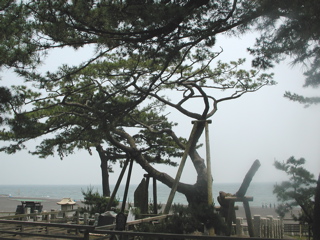 柿田川で休憩していたが、日が照って暑くなって来たので、清水市の三保の松原へ向かった。ここは、天女が舞い降り羽衣を掛けたという伝説を生んだ樹齢650年の「羽衣の松」 がある。