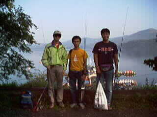 我々が攻めたポイントは旭日丘地区より東の静山荘のボート屋周辺。朝もやが立ちこむなか、湖面をのぞくとベイトフィッシュが.....だれもが今日はけっこう釣れるだろうと疑わずボートに乗り込んだ。早朝、いきなり茂浦君がスピナーベイトで1ぴきの釣果。しかしそれ以降だれもバイトがなくぷっつり。まったく釣れね〜。ということで綺麗な富士山、そしてやる気がなくなって寝込んでしまった伊藤君を1枚。
