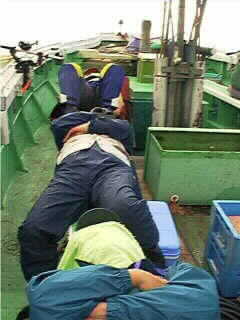 castからいきなり2時間くらいの間、サバとソウダカツオの入れ食いであった。コマセを詰めて1キャストするごとに1〜2匹かかる。メジは釣れないが、とりあえず入れ食いなのでこの状況を楽しんでいた。ふと横をみると、一緒に同行した青木さん、神永さん、三重さんは顔色が真っ青になっていた。『やばいよ〜気持ち悪くて、釣りどころでないよ!』神永さんがそう言ったとたん、三重さんと神永さんが交代で便所に駆け込みあって、青木さんは便所まで歩く元気もなく、海に向かってコマセをぶちまけて続ける...そのうち3人とも寝込んでしまった。