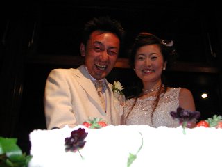一度目の衣装替えのころは結構できあがっていたように思われる。小松、ノラ、松田で恒例の一枚。ドレスへの衣装替え後、ケーキ入刀!幸せいっぱいの表情ですね。