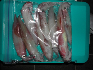 9:00頃からポツポツ釣れ出したが、イカの乗りが悪く、バラシが多いため思うように釣果あげられないまま13:00のタイムアップを迎えてしまった。今までのなかでも最低に近い釣果となった。記録はヤリイカ7ハイ。イカ釣りは船上では写真を撮る暇もないくらい忙しいので帰宅時に撮影。