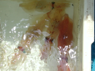 で、釣り上げたイカは海水を巡回させた生け簀(といってもバケツだけど)に入れ、帰る直前まで生かしておくので、新鮮な刺し身が堪能できるのが魅力だ。