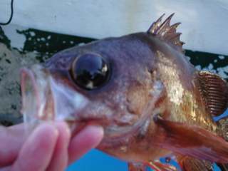 今回の対象魚イワシメバルは、その名の魚種がいるのではなく、生きたイワシでメバルを釣る釣法である。仕掛けの道糸は0.8〜1号と細い糸を使うので、イワシをメバルが追いかけて食いついているのが分かり楽しいが、アタリを見極めるのが難しく、早合わせは禁物で基本は向う合わせである。おまけに食いが渋くアタリ以上のばらしがあった。釣果はあまり延びなかったが、メバルの大きさは抜群(28cm)、メンバの中で一番の大物をつり上げた。もう少しで尺超え!残念!