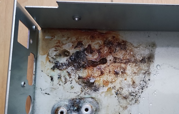 筐体内部に侵入した水滴が基板底部を濡らし、各電装部品の間で短絡が発生、、