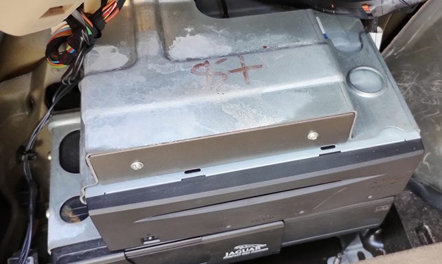 3段(TVチューナ/ナビ/CDC)に積まれたユニットの上に”雨だれの痕”が!!!