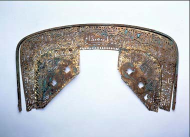 | 『北方騎馬民族にとって馬具は必要不可欠のもので、高度に発達するとともに豪華な装飾もなされた。 この鞍金具は、中国の東北地方を占拠して 前燕国(352年〜370年)を建てた鮮卑族慕容部の上層人物の墓から出土し、 鞍の前後の前輪と後しず輪わにおいて、木芯の鞍を包み飾るものである。前輪、後輪ともに外側の磯と内側の海(翼形部) の2部から成り、いずれも透彫により亀甲形の中に鳳凰、龍、羽人、怪獣などを表し、鍍金を施している。 この墓からはまた重装備騎兵の防具である鉄兜、鉄馬冑、鉄馬甲などの甲騎具装が中国で初めて出土し、 これらが朝鮮半島、更に日本へと伝わっていったのである。 1988年遼寧省朝陽市十二台墓地出土 』 |